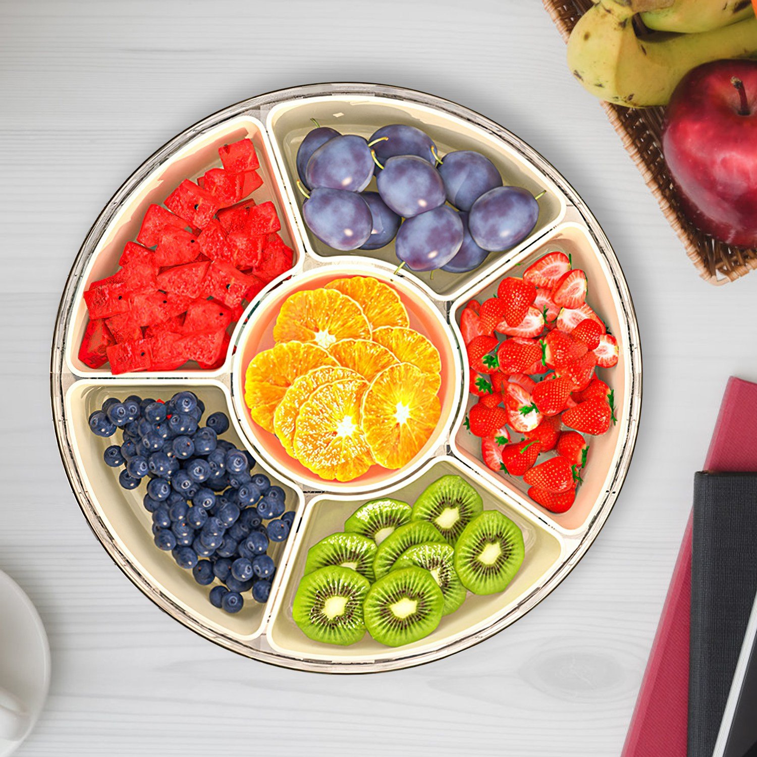 Perfect for storing snacks, fruits, nuts, candies, and even salads, our divided serving tray is designed to keep your snacks and fruits neatly sorted while preventing any unwanted mixing of flavors. Sealed lid with silicone circle and secure latches helps maintain freshness and cleanliness of food. And hidden handle ensures convenient portability wherever you go. 360° rotatable base makes serving yourself and your guests much easier than ever before. Whether you\'re camping, hosting a party, enjoying a picnic, or having a family movie night, our divided snack box containers is your best choice!