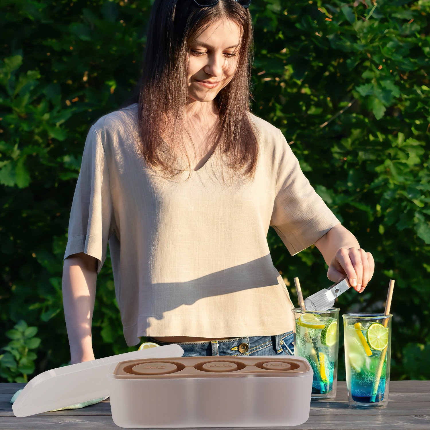 Our innovative ice cube tray can create three different sizes of hollow cylinder ice molds, specifically designed for 20/30/40OZ Stanley cups. Made from safe food-grade silicone material, our ice cube mold is odorless, ensuring durability and reusability. The highly heat-conductive silicone allows for faster ice cube formation, while the unique hollow cylinder design reduces melting time and preserves the undiluted flavor. These 0.5in thick hollow cylinder ice molds can be stacked to fit tumbler cups, enhancing your summer drinking experience by adding ice cubes to coffee, cocktails, whiskey, juice or other beverages.